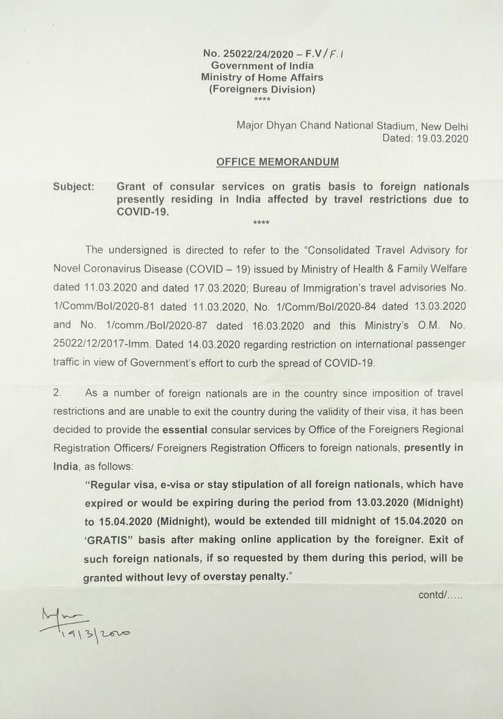 In conseguenza delle restrizioni agli spostamenti imposte dalle Autorità indiane per contenere la diffusione della sindrome da nuovo coronavirus (Covid-19), le stesse Autorità – nel confermare la validità dei visti rilasciati a stranieri che si trovino già in territorio indiano – hanno disposto che questi ultimi potranno contattare gli uffici FRRO (uffici di registrazione degli stranieri: https://indianfrro.gov.in/eservices/home.jsp) per ottenere estensioni temporali o conversioni del loro visto/titolo di soggiorno in India.